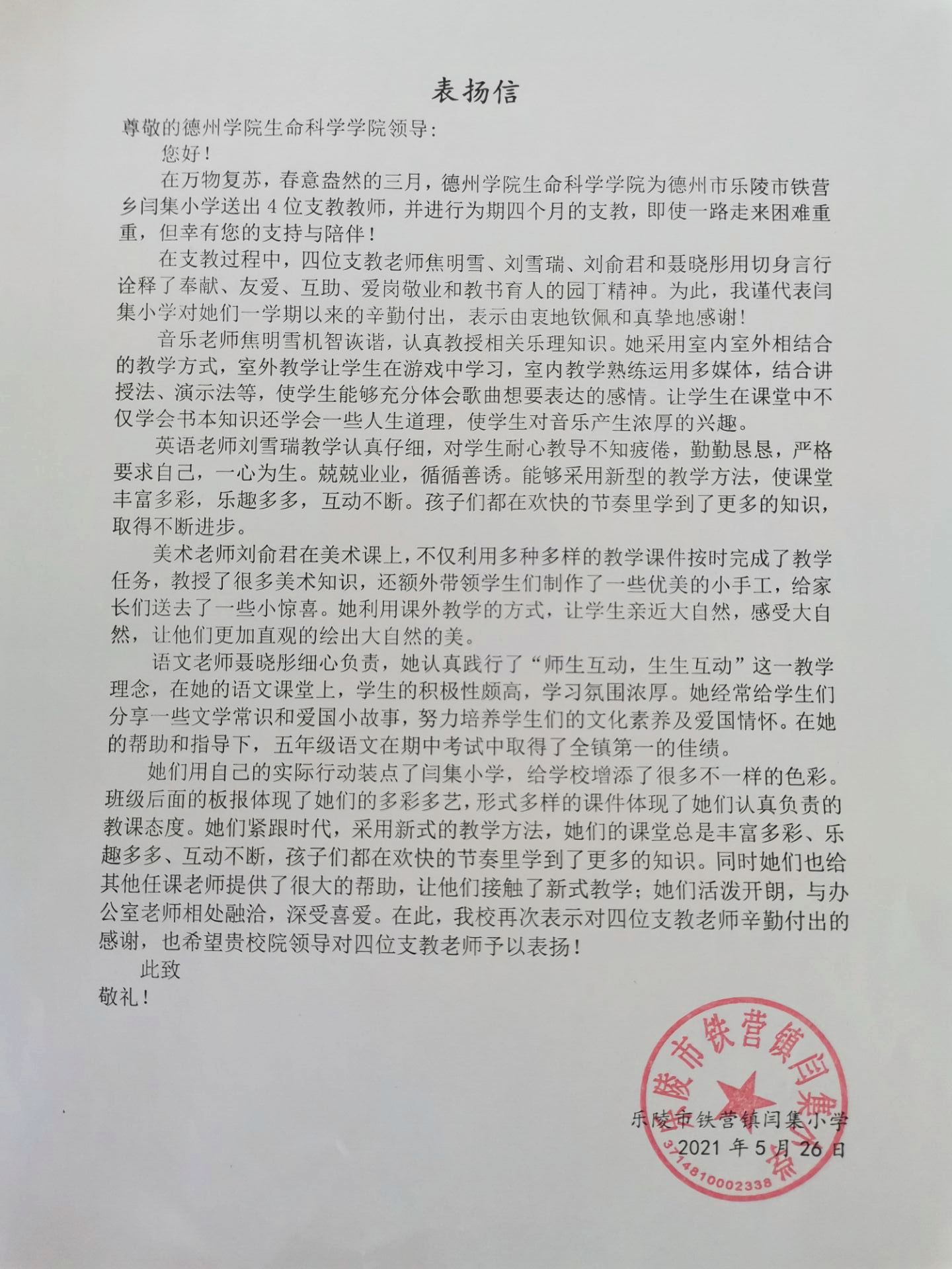 2021年6月3日,2018级生物科学本科班焦明雪、刘雪瑞、刘俞君和聂晓彤四位同学因在支教期间表现突出,受到了支教学校乐陵市铁营镇闫集小学的表扬。