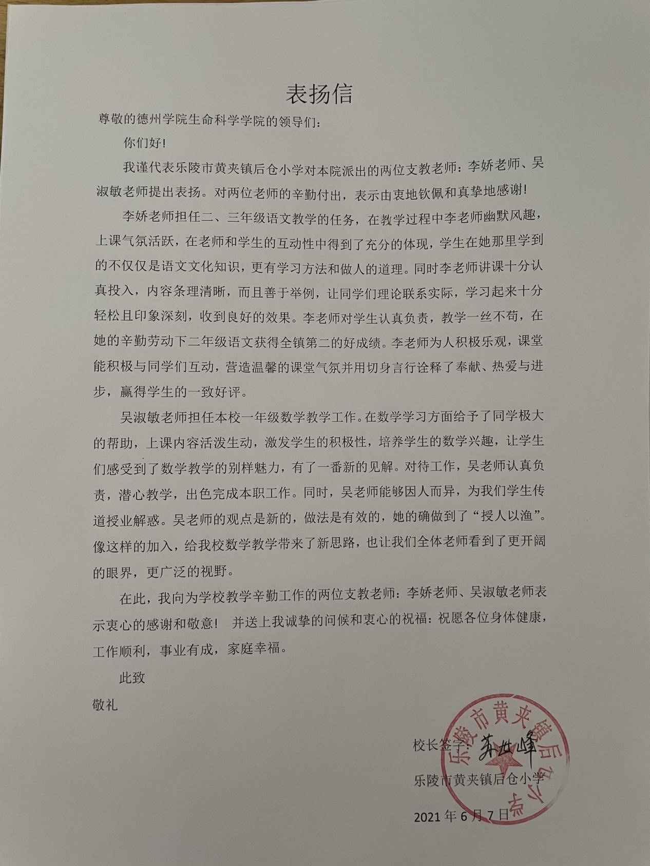 2021年6月7日,2018级生物科学本科班李娇、吴淑敏两位同学因在支教期间表现优异,得到支教学校的认可,受到乐陵市黄夹镇后仓小学校领导高度赞扬。