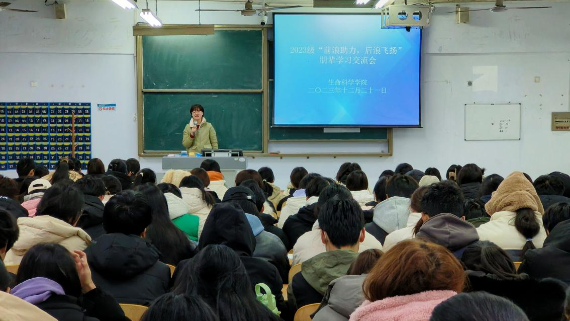 12月21日晚,威廉希尔WilliamHill于求实楼0117教室举办“前浪助力,后浪飞扬”朋辈学习交流会,此次会议邀请了22级生科二班孙悦、生科一班李萌、食品班宋欣、生科二班张尔迪,23级全体员工参加会议。23级辅导员孙珍辉主持。