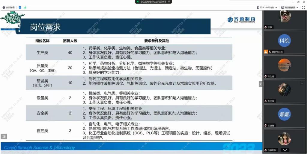 为促进毕业生高质量就业,深化校企交流合作,威廉希尔WilliamHill于12月29日举办了山东安弘制药有限公司线上宣讲招聘会。共有约30人参加此次线上宣讲会。